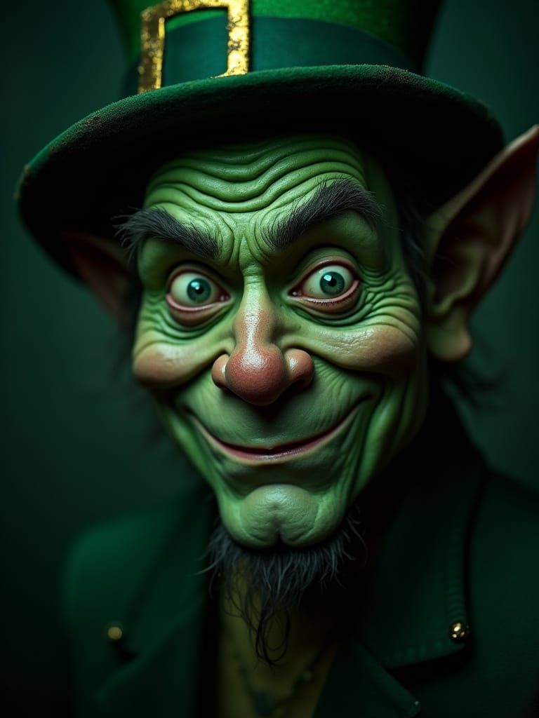 A striking image of a melancholic leprechaun with wrinkled features, set against a dark backdrop and illuminated with dynamic lighting, evoking a sense of cinematic storytelling