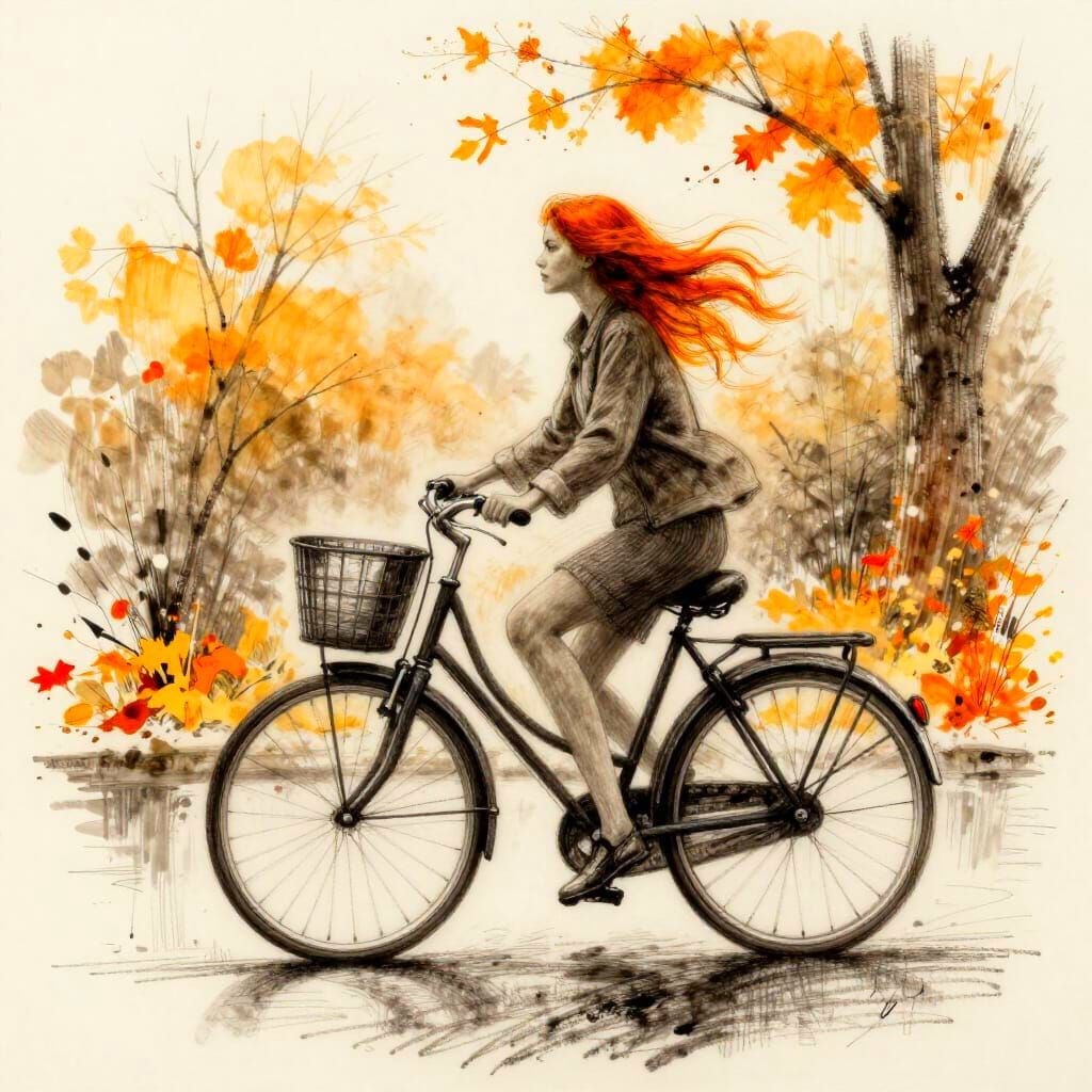 This maximalist charcoal sketch captures a flowing amber-haired woman and a bicycle on a rain-soaked autumn path with vibrant color splashes.