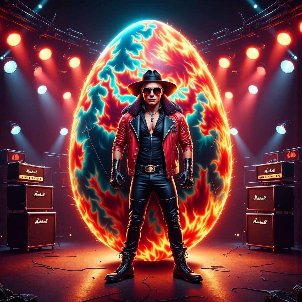 This image depicts a fiery, ornate egg as a confident rock music artist, surrounded by neon lights, spotlights, and Marshall amplifiers, embodying the rebellious spirit of rock 'n' roll in a bold, studded leather jacket and shades.