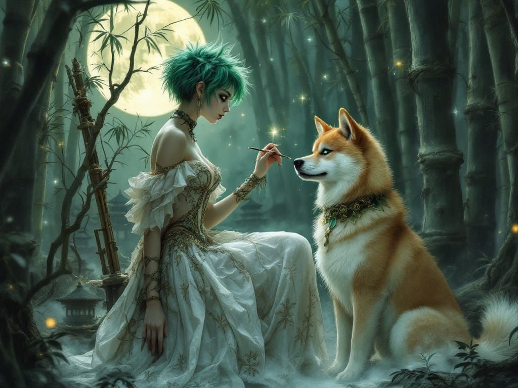 This enchanting image depicts a gothic fairy painting a Shiba Inu in a mystical bamboo forest, surrounded by ancient pagodas and gnarled trees, under the soft glow of fireflies and misty night air, in a style inspired by dark fantasy and ukiyo-e woodblock printing.