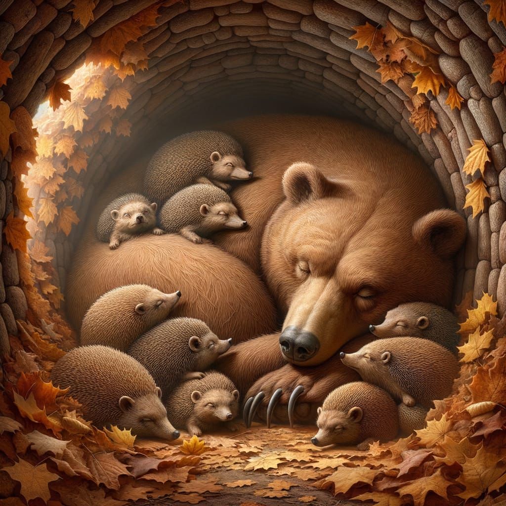 This enchanting scene depicts a peaceful underground hollow lined with autumn leaves, where sleepy hedgehogs snuggle together in slumber. A comical bear tries to join in, but his attempts are thwarted by the hedgehogs' sharp quills, amidst a surreal mist with a whimsical, hyperdetailed quality reminiscen...