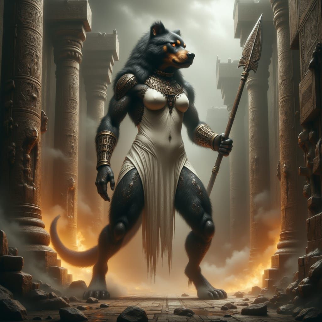 canine human female hybrid with the head of a rottweiler, her body covered rottweiler fur she wears a white bodycon dress stands aggresively on her canine legs holding a spear in her hand, background ancient egypt ,