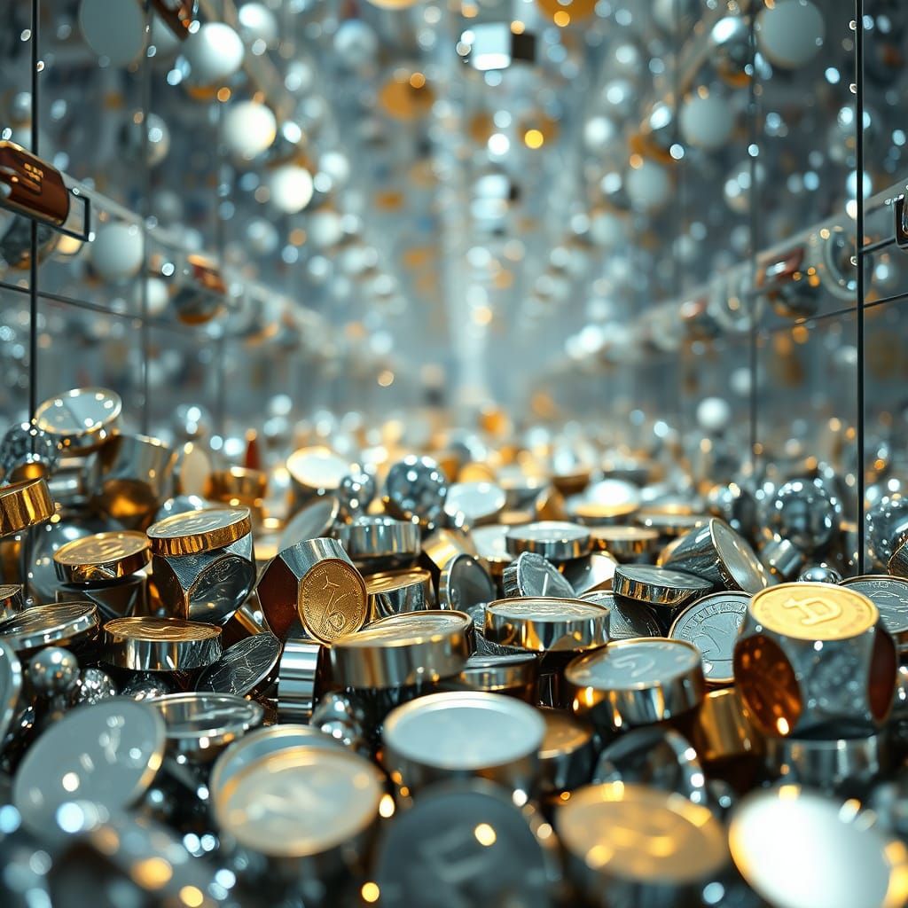 A hyperrealistic macro photograph showcases an intricate installation crafted entirely from gleaming coins, arranged in detailed patterns with captivating light reflections and metallic luster.