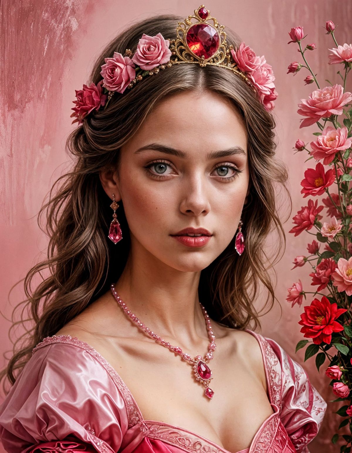 This image shows a digital portrait of a princess. She is depicted in shades of pink and red, creating a vibrant and regal aesthetic.