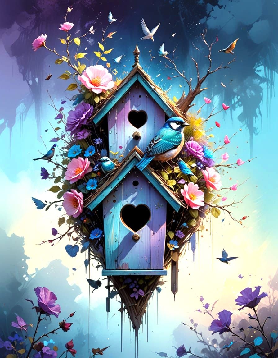 This image shows a heart-shaped birdhouse surrounded by colorful flowers and a vibrant bird. The watercolor painting style uses a faded effect and dramatic lighting to create a beautiful scene.