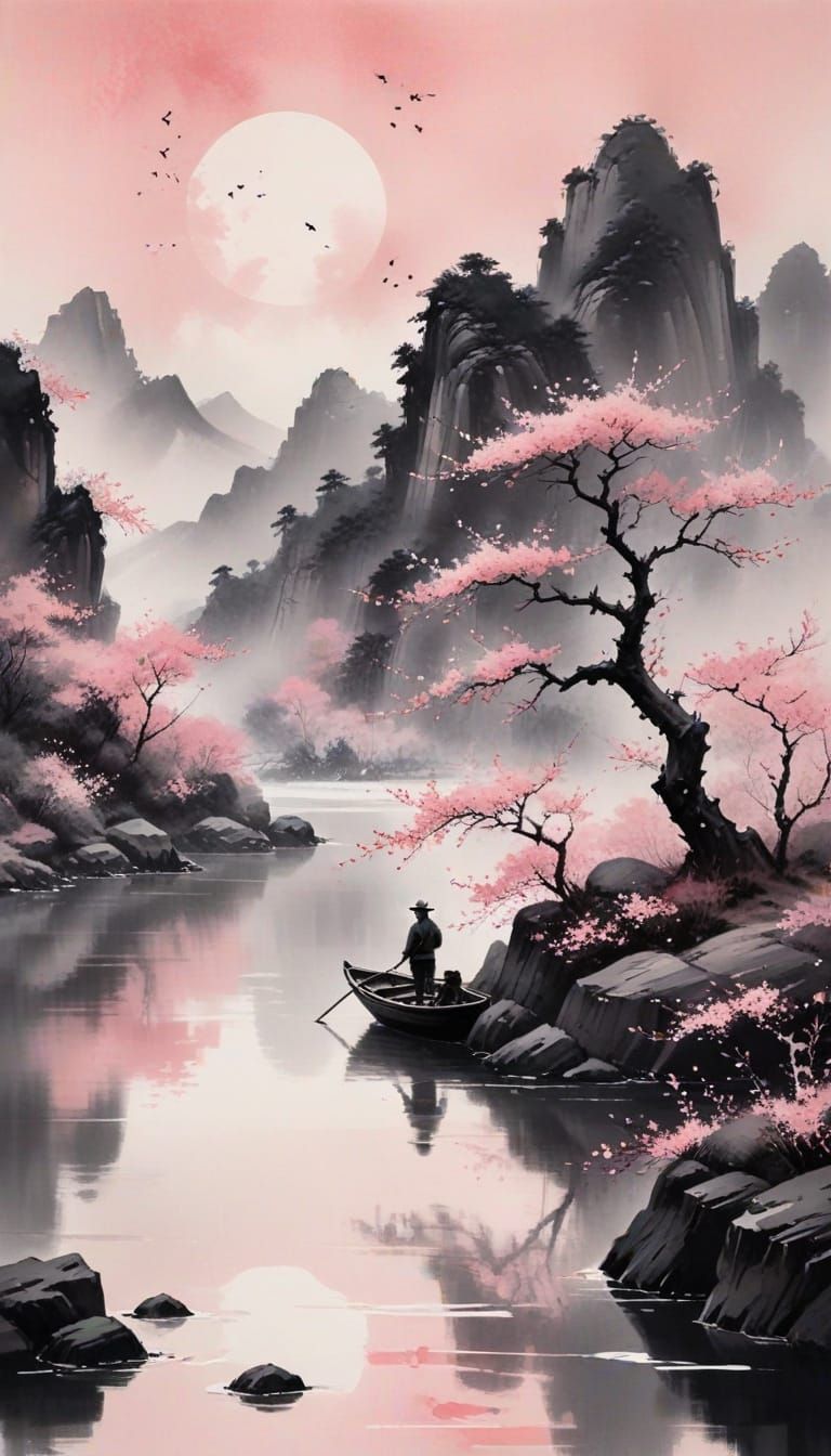 A serene image showcasing a lone angler on a boat amidst a minimalist landscape of mountains, a river, and cherry blossoms. The artwork evokes a Chinese ink painting.