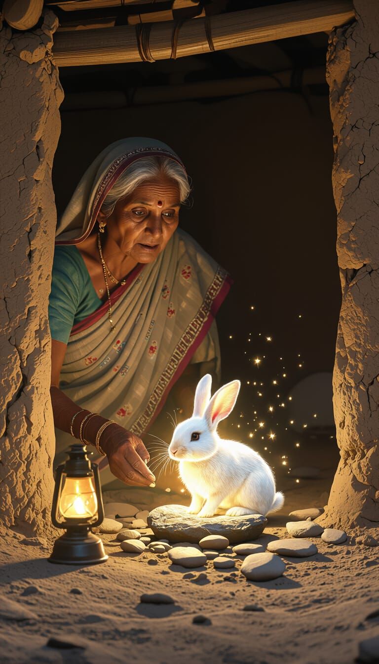 This image shows an elderly Indian woman in a mud house witnessing a magical stone cracking open. A realistic white rabbit emerges, glowing with golden and silver light, rendered with detailed textures.