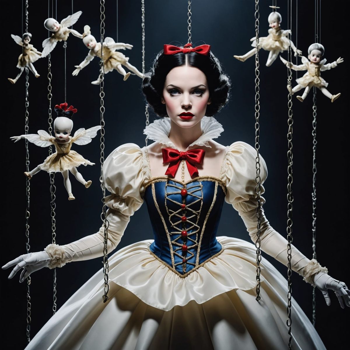 A double exposure image features a marionette show of a dark Snow White. Snow White controls marionettes in the style of professional product photography.