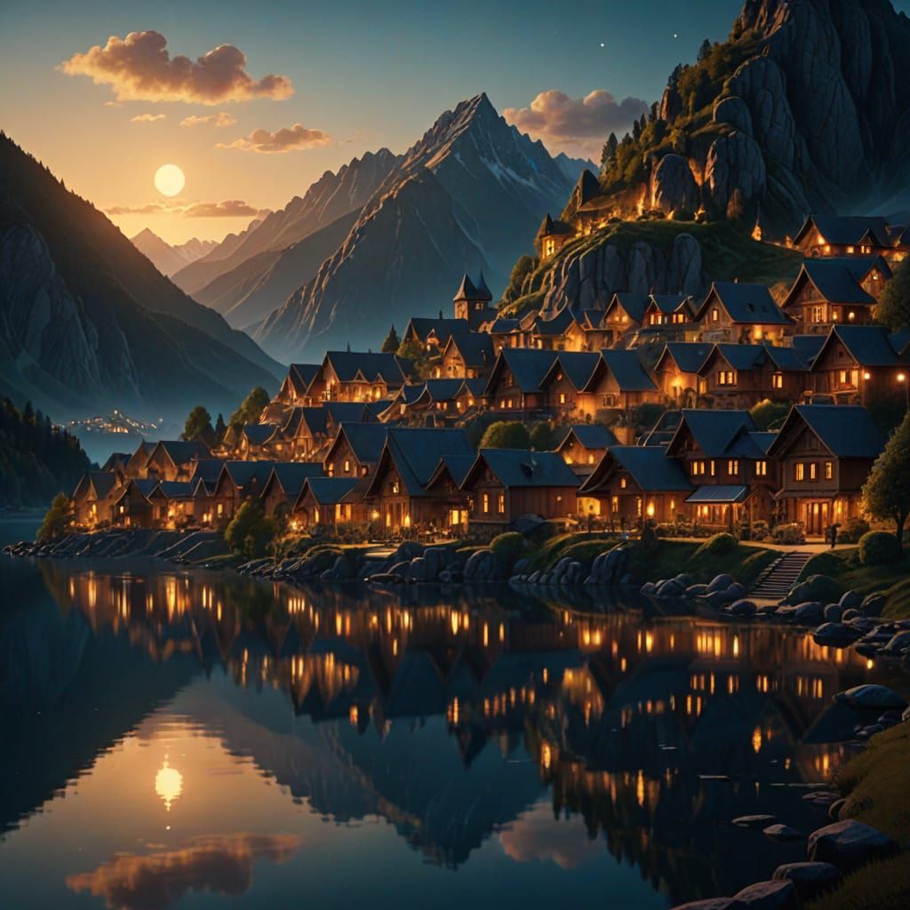 This image shows a tranquil lakeside mountain village at night, illuminated by warm golden lights and glowing lanterns. Reflections shimmer on the water in this highly detailed digital painting.