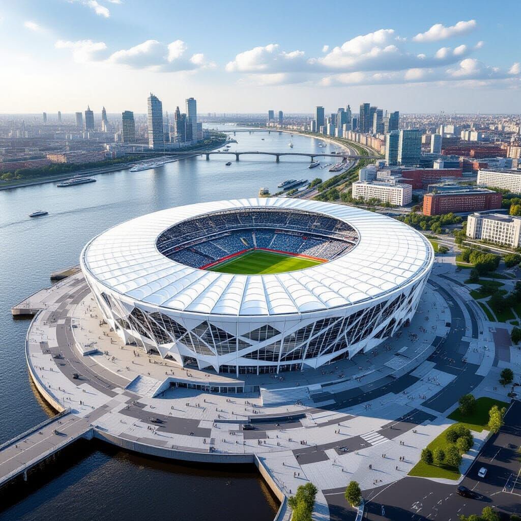 A dynamic aerial view of Nizhny Novgorod stadium at the confluence of two rivers. The image features football players in action, rendered with architectural flair.