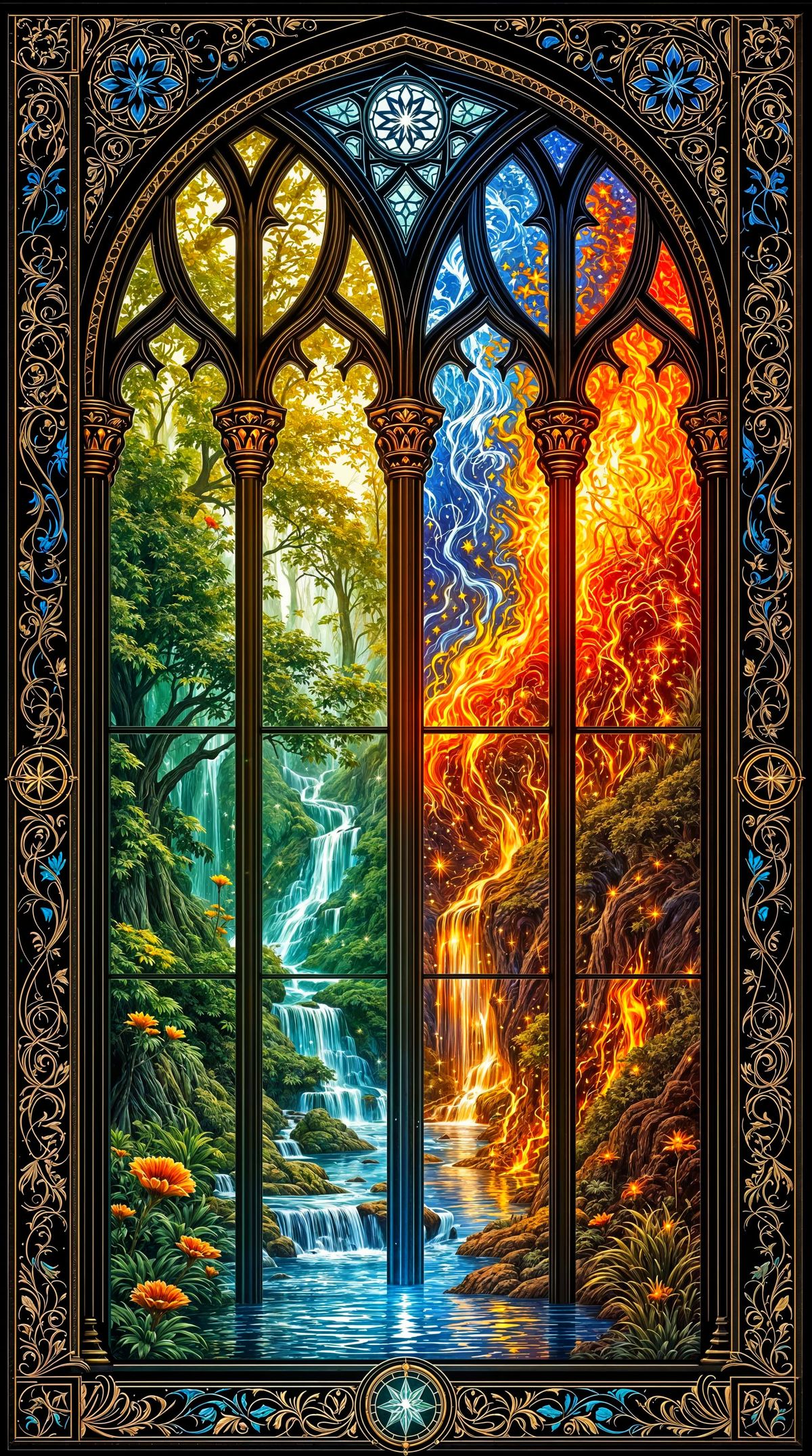 This stunning digital stained glass artwork depicts the harmony of Earth, Wind, Fire, and Water in a majestic Gothic-inspired scene. Intricate carvings, luminous backlighting, and jewel tones bring the elements to life in a vibrant, shimmering display.