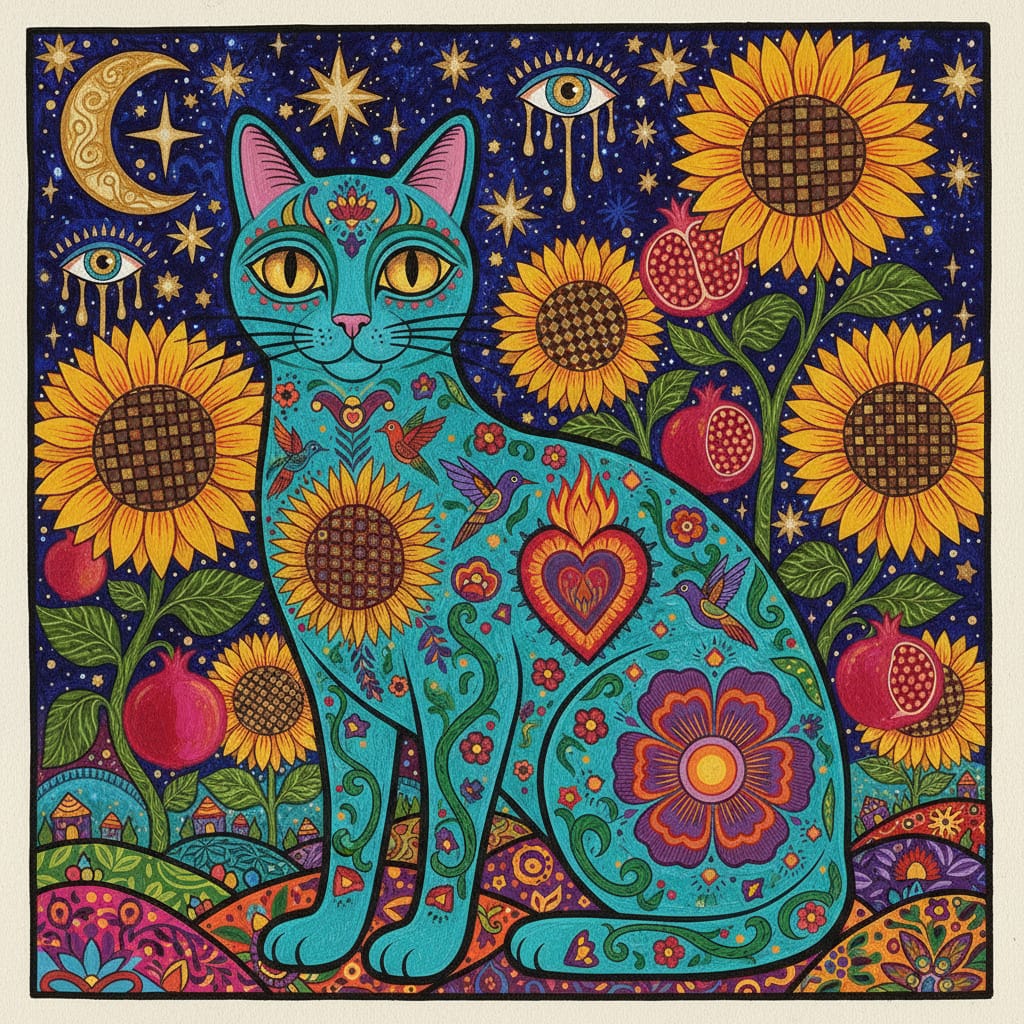 A vibrant, decorative illustration of a turquoise cat with golden eyes, painted in a Mexican folk art style. Features floral patterns, sunflowers, and a starry night sky with bold outlines and a hand-painted texture.