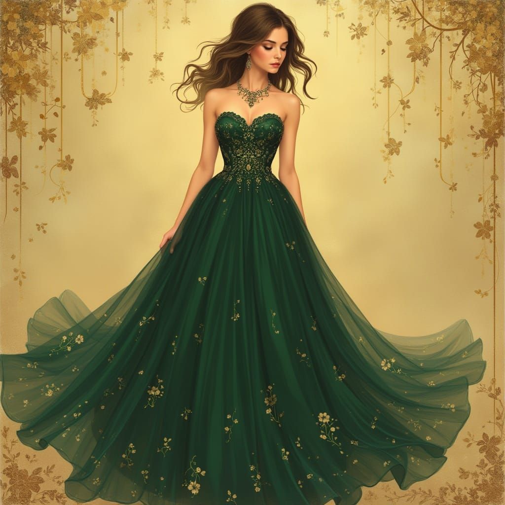 This image features a woman wearing a stunning dark green prom dress with delicate embroidery and a flowing silk skirt, set against a soft golden backdrop, evoking the elegance of Art Nouveau and the whimsy of fantasy illustrations.