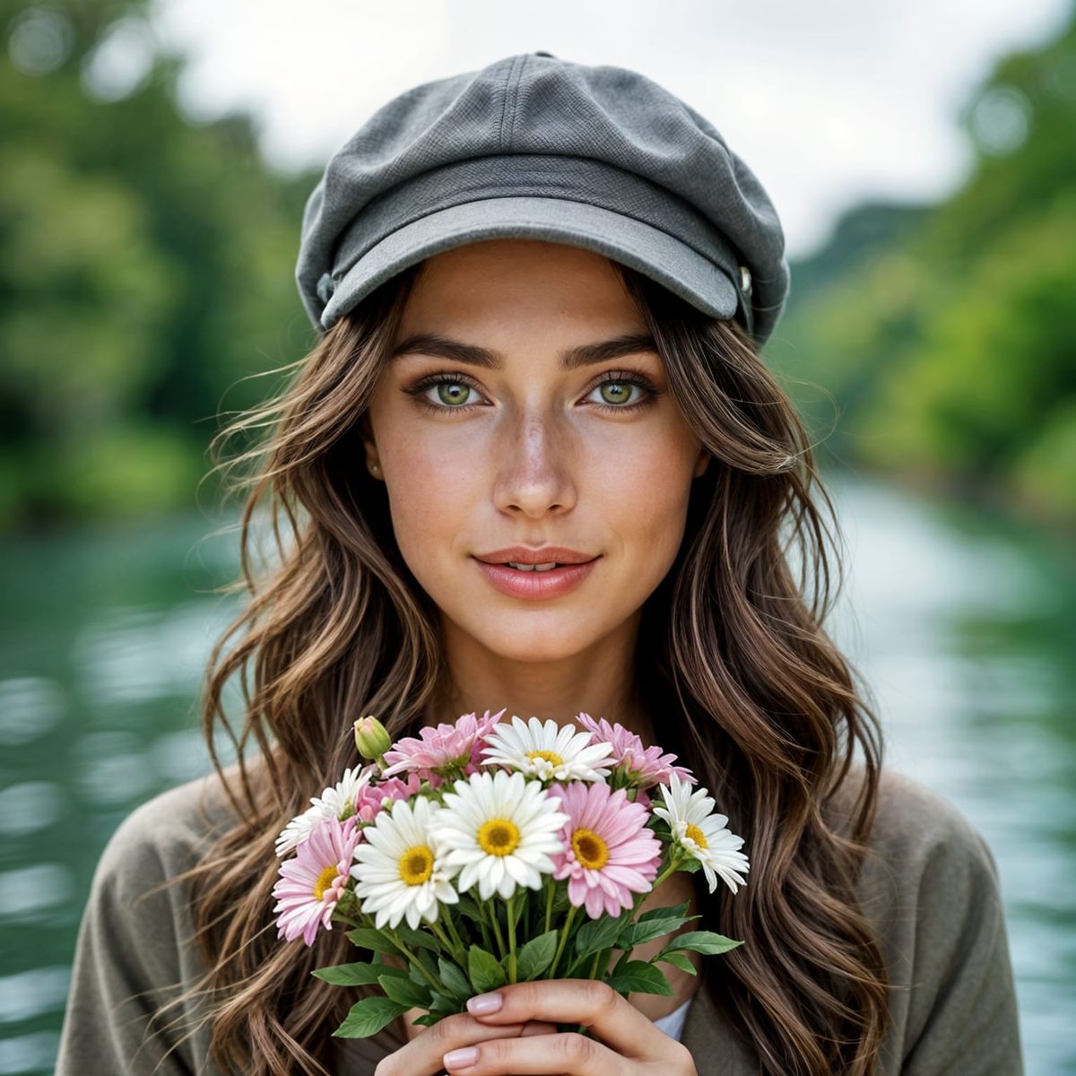 This image presents a hyperrealistic portrait of a beautiful French woman wearing a cap and holding flowers. The scene is set by a serene river, capturing a moment of natural elegance.
