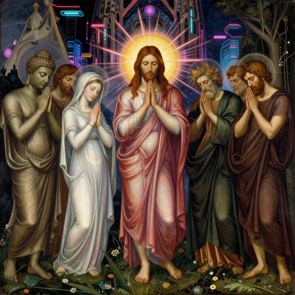 botticelli painting style : buddah, jesus, moise,, marie, apollon, dyonisos, saint-augustin, saint-pierre, all praying together with hand on forehead, ,very connected spiritual, gaudi in background, third eye chakra, ray of lights between characters, ultra deep contrast, large scene composition, , ROMA, ...