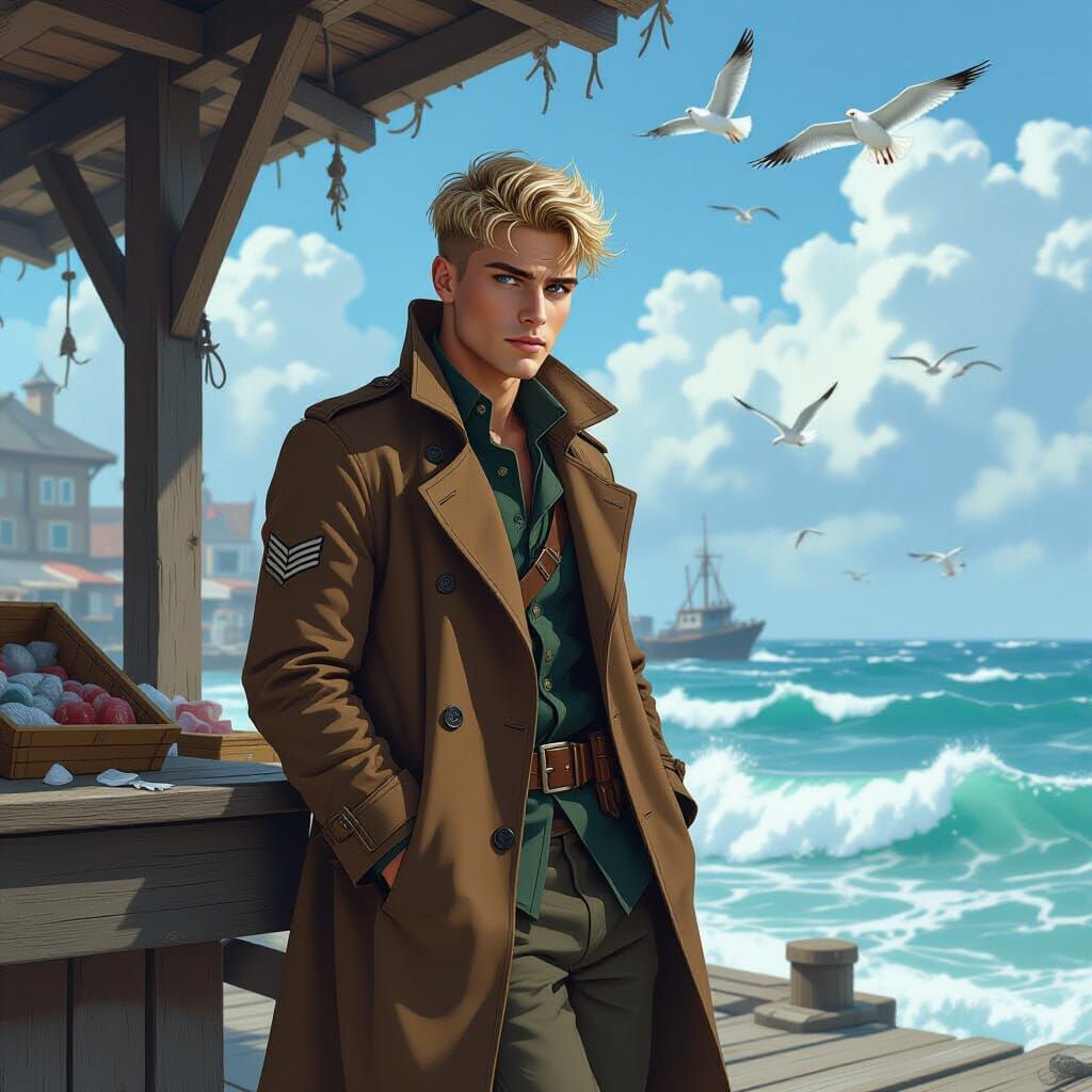 This image shows a feminine male soldier with blonde hair and blue eyes in a tattered coat, leaning against a market stall on a bustling dock. The artwork evokes atmospheric realism with industrial and expressive character designs.