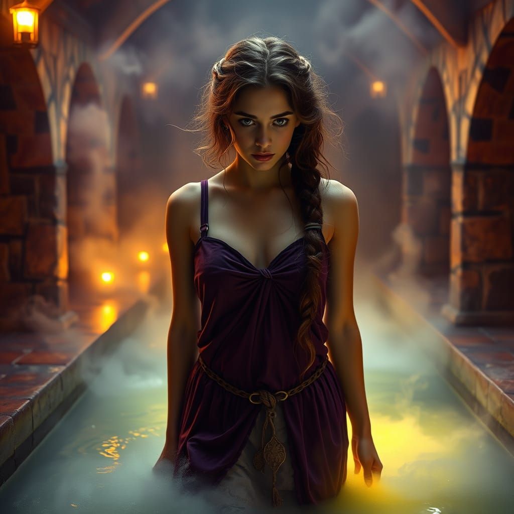 This image depicts a young woman with curly chestnut hair walking towards a mystical medieval bath, surrounded by luminescent torches and swirling mist, in a style that blends dark fantasy and Art Nouveau elegance with hyper-realistic details and vibrant colors.