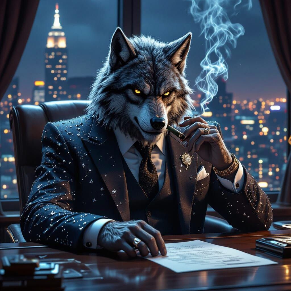 Digital painting. Wide shot. A werewolf mob boss sits at his desk in a penthouse, overlooking a city at night. He smokes a cigar and wears a suit made of diamonds. Hyperrealistic, cinematic lighting, a masterpiece, best quality, 8k resolution, octane render, trending on artstation, dramatic, dynamic ...