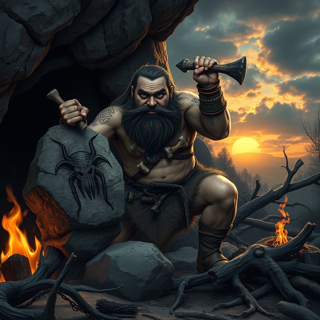 A striking picture of a bearded man in a bone-adorned loincloth, dynamically chiseling an alien image on a rock near a cave entrance. The image evokes a hyper-realistic, cinematic, and dark fantasy aesthetic.