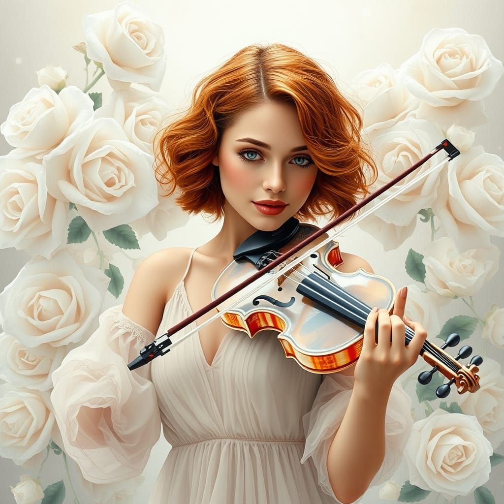 This image shows a beautiful woman with copper curls playing a transparent violin, surrounded by white roses. The artwork features double exposure and fractal elements in a surreal watercolor and vector graphic style.
