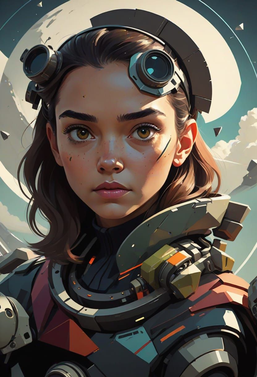 A digital illustration of a lone writer in a post-apocalyptic landscape. The low poly art features expressive brushstrokes, warm lighting, and a retro-futuristic aesthetic with ethereal backgrounds.