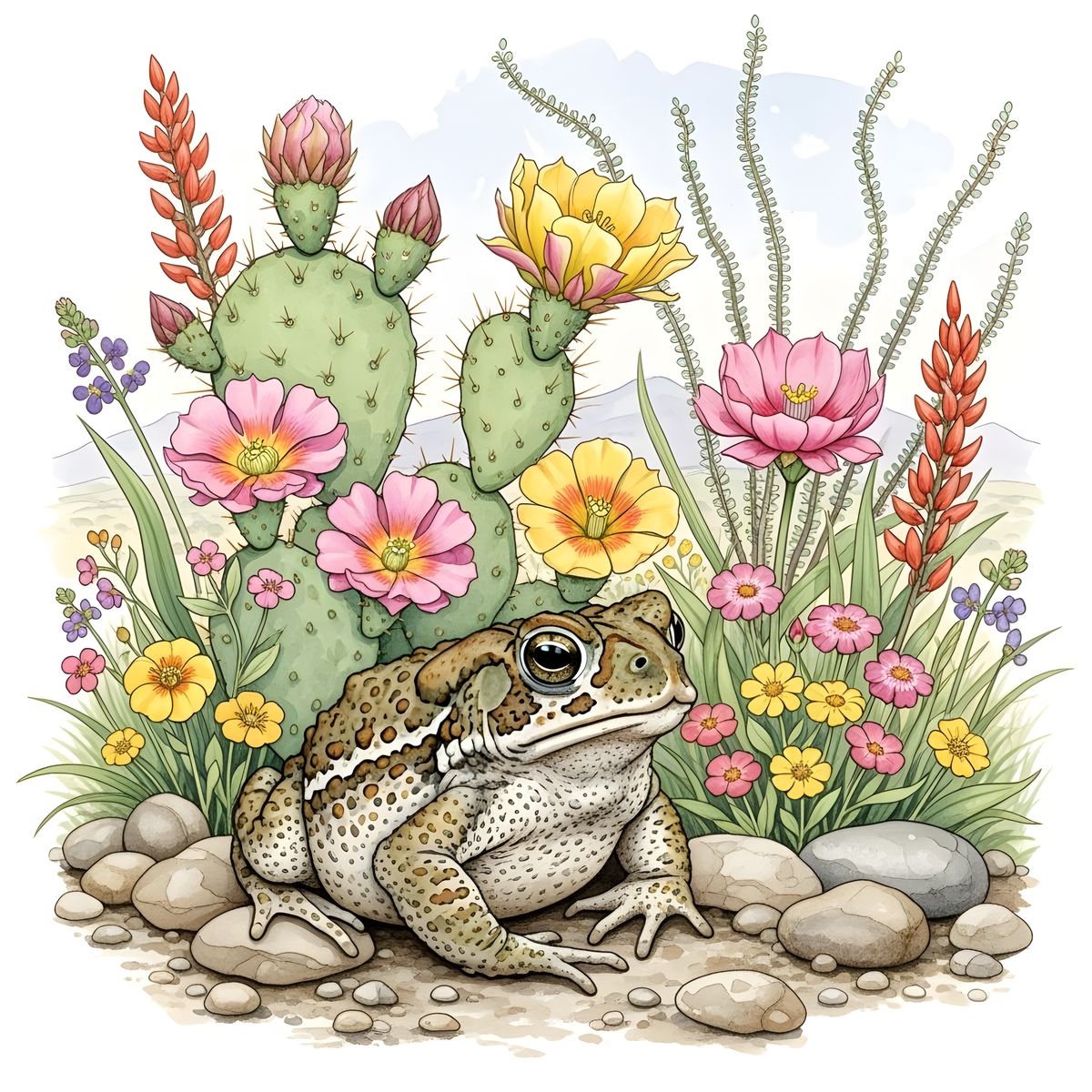 This image shows a Colorado Toad in a desert habitat with vibrant flowers. Rendered with delicate watercolor techniques, the scene evokes Beatrix Potter's illustrative style with a touch of whimsical anthropomorphism.