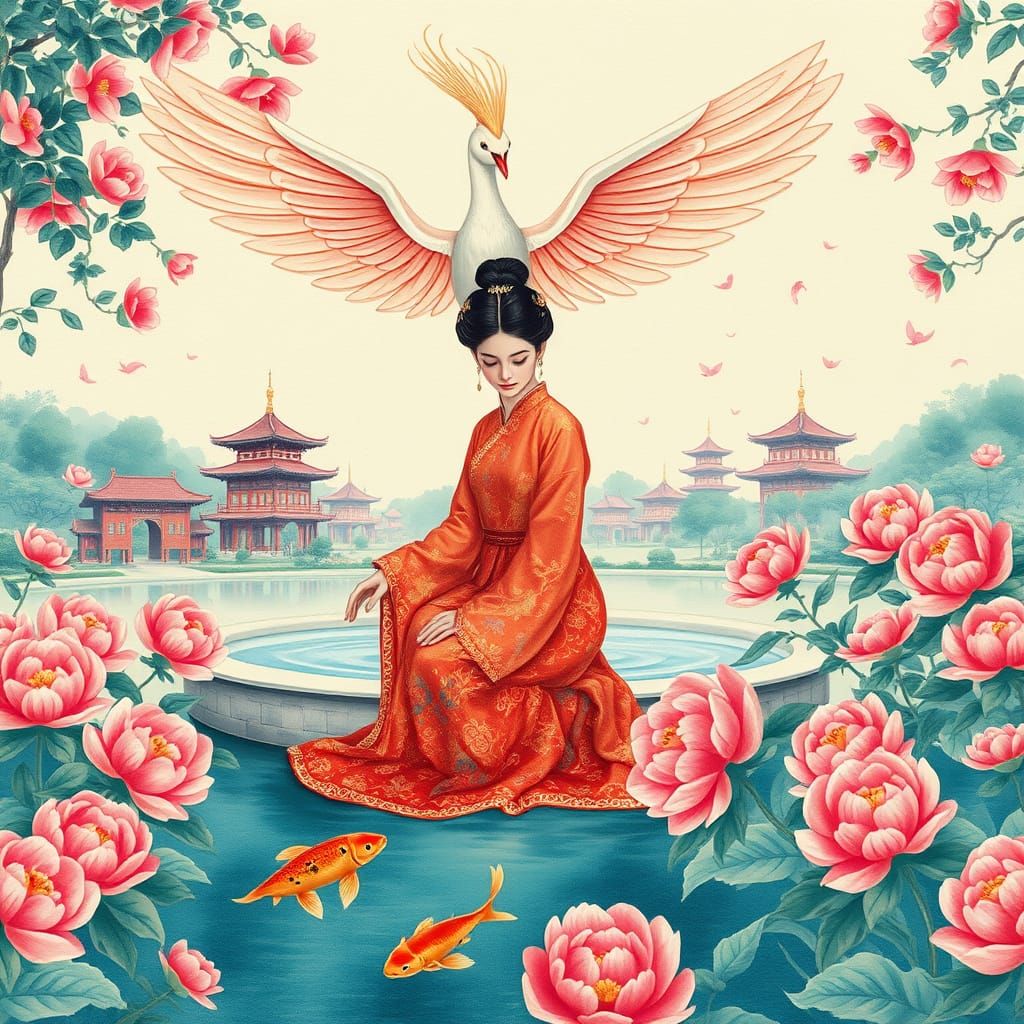 This serene watercolor painting depicts a Turkish princess in a lush garden filled with blooming peonies, surrounded by Chinese lotus motifs and majestic Anka Kuşu, set against a rich palette of crimson and turquoise, blending elements of Turkish and Chinese art with Japanese sensibilities.
