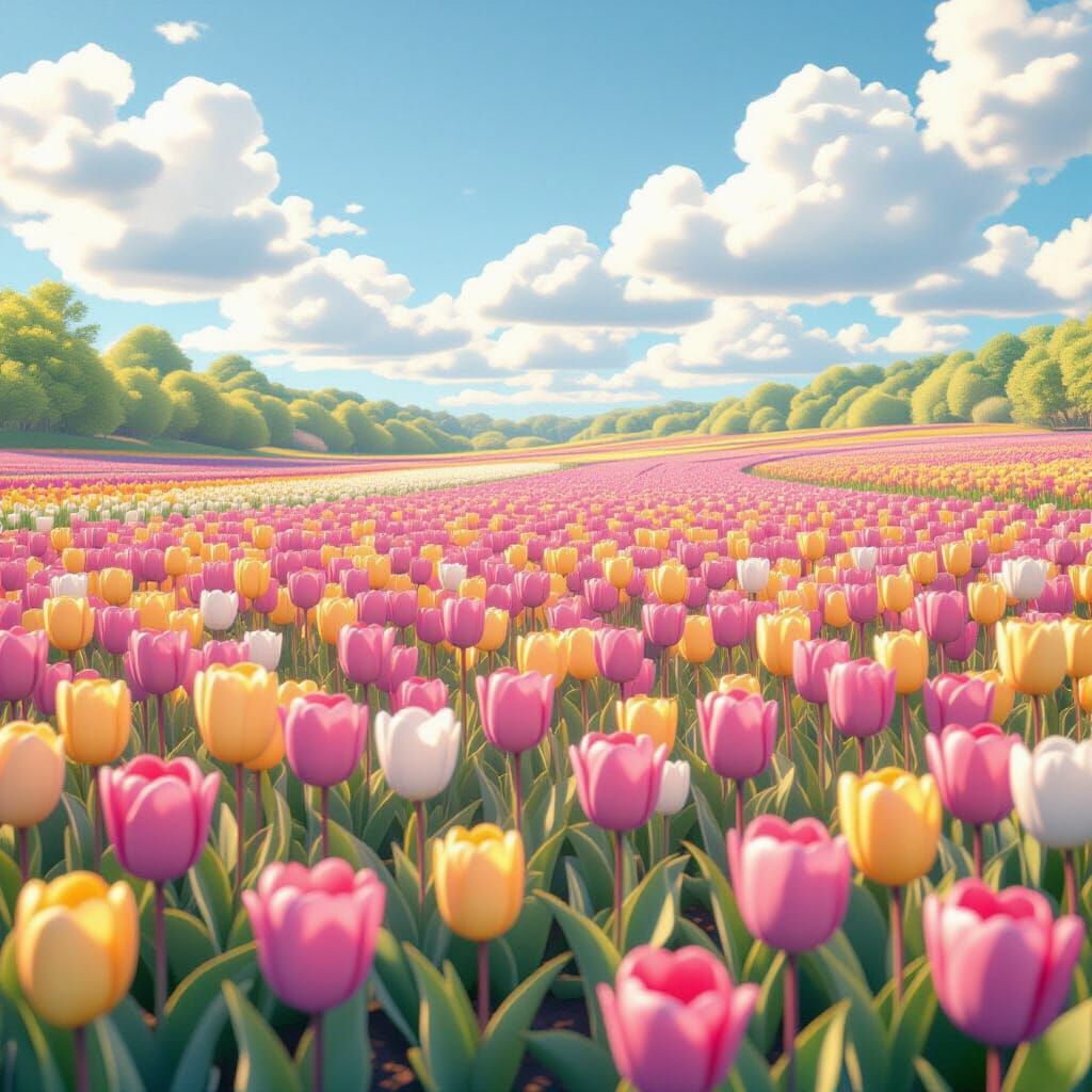 A vast field of pastel tulips under a blue sky. This image is rendered in a soft, cheerful, kawaii illustration style, inspired by 3D anime art.