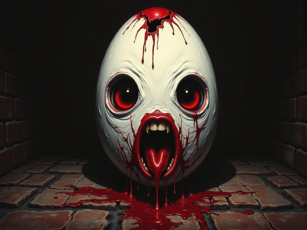 This image depicts a disturbing horror-core egg with large red eyes and an open mouth, its head cracked with blood spilling out, set against a brick wall. The scene evokes intense fear with deep contrasting colors and flashing lights, presented in a hyper-realistic, detailed style reminiscent of Japanese...