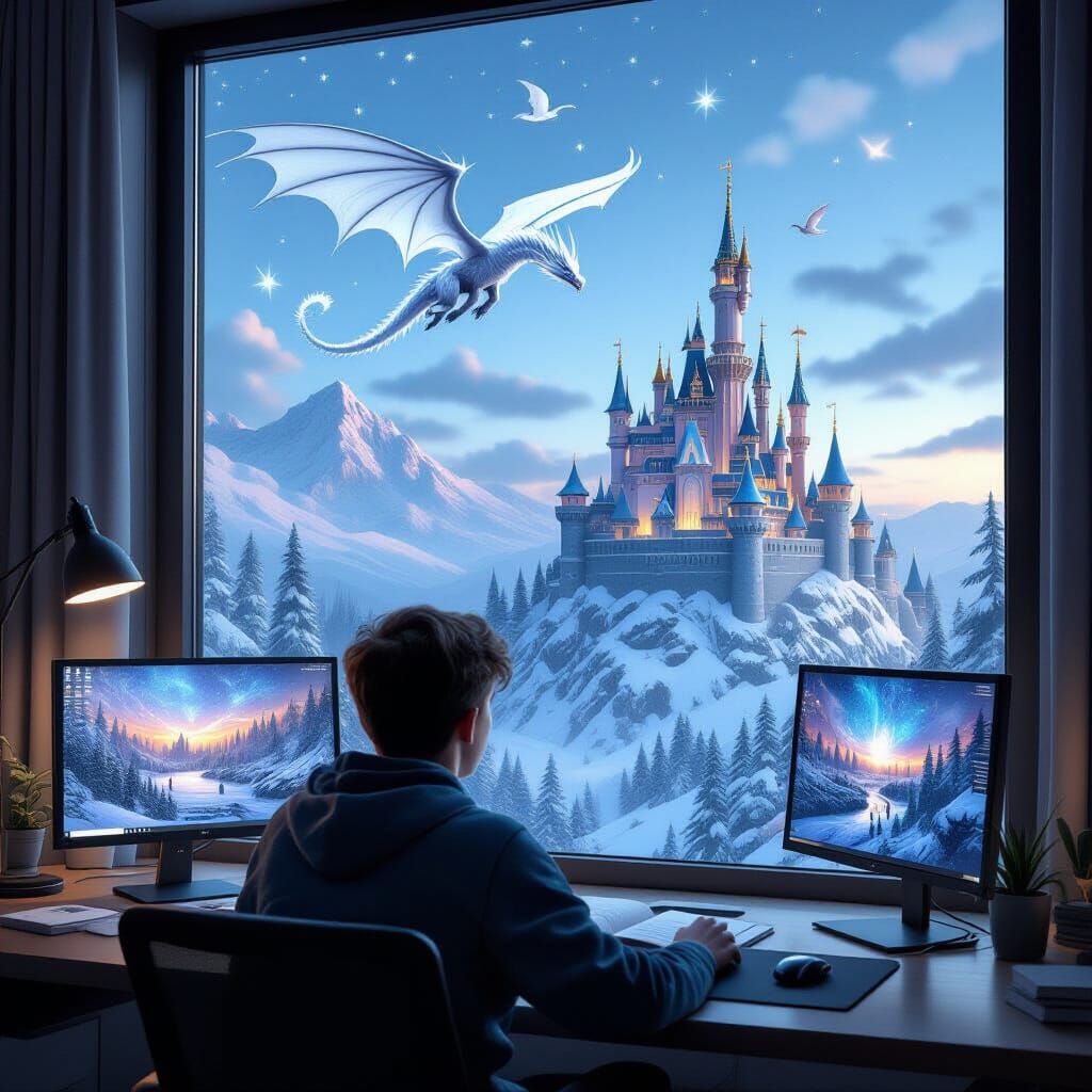 This cinematic image shows a teen reading by a desk, gazing out at a magical world with a castle and dragon. The scene is rendered with a photorealistic, cinematic quality.