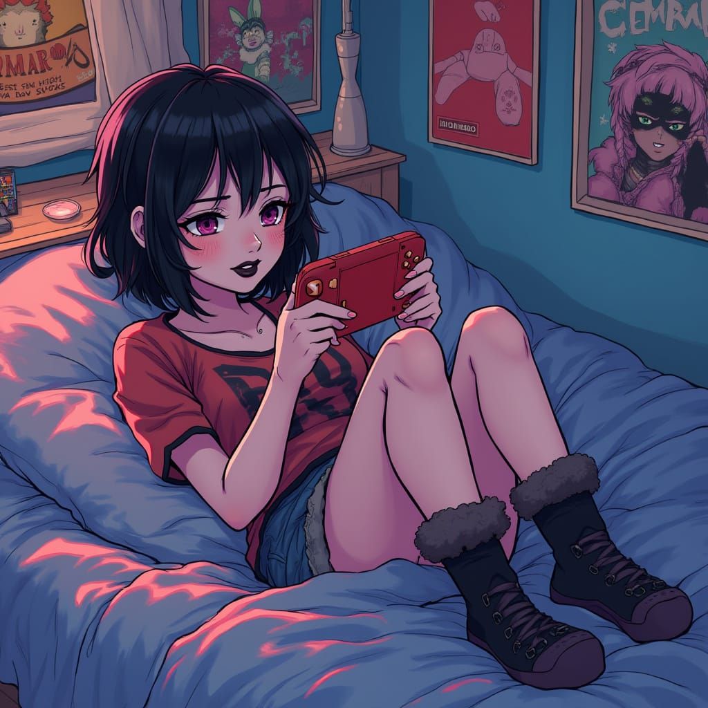 This image shows a young woman relaxing in her cozy gamer lair, surrounded by vibrant colors and bold lines reminiscent of anime greats. She's a goth gamer girl at heart, with a short black bob and septum piercing, playing Nintendo Switch in a relaxed pose.
