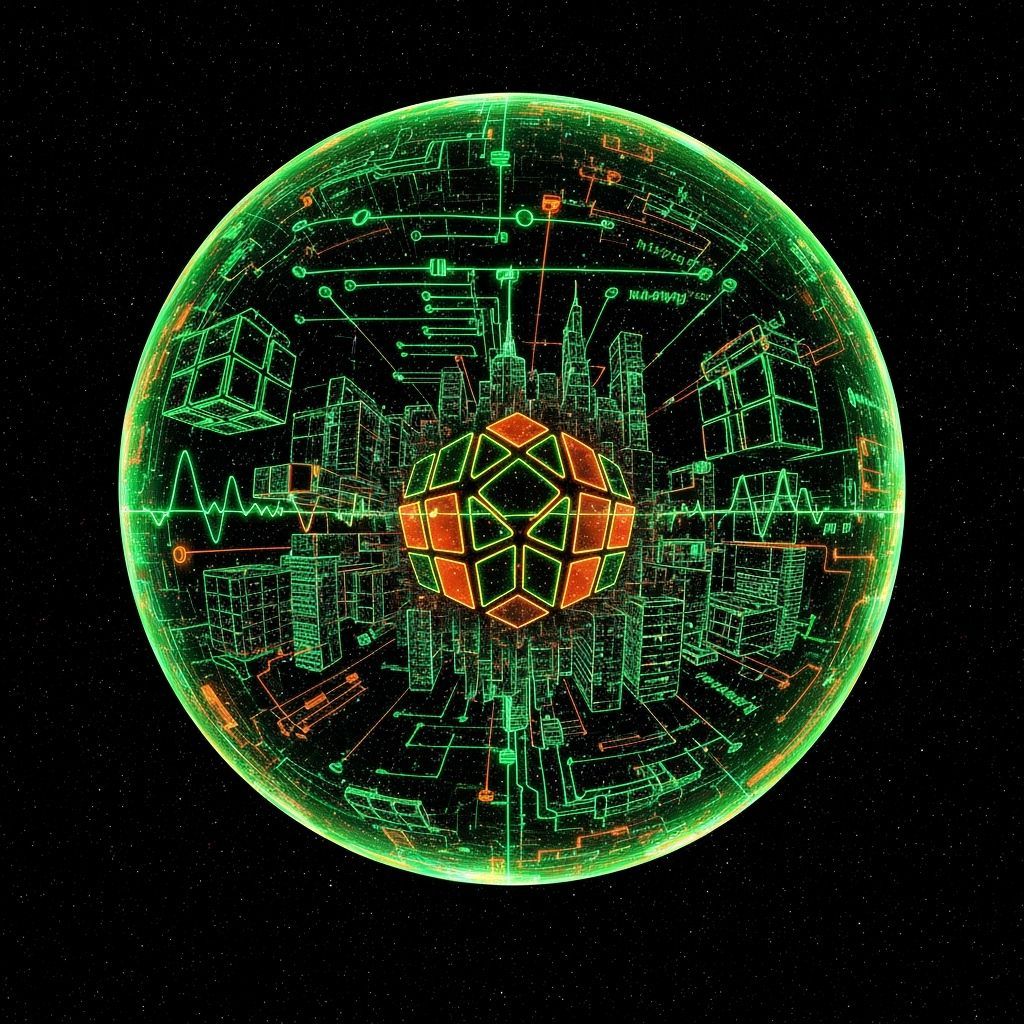 This image shows a decopunk spacecore design with neon green and orange hues. It features elements like a Rubik's Cube, fractal bubbles, an arcology city, and circuit diagrams against a black starry sky.