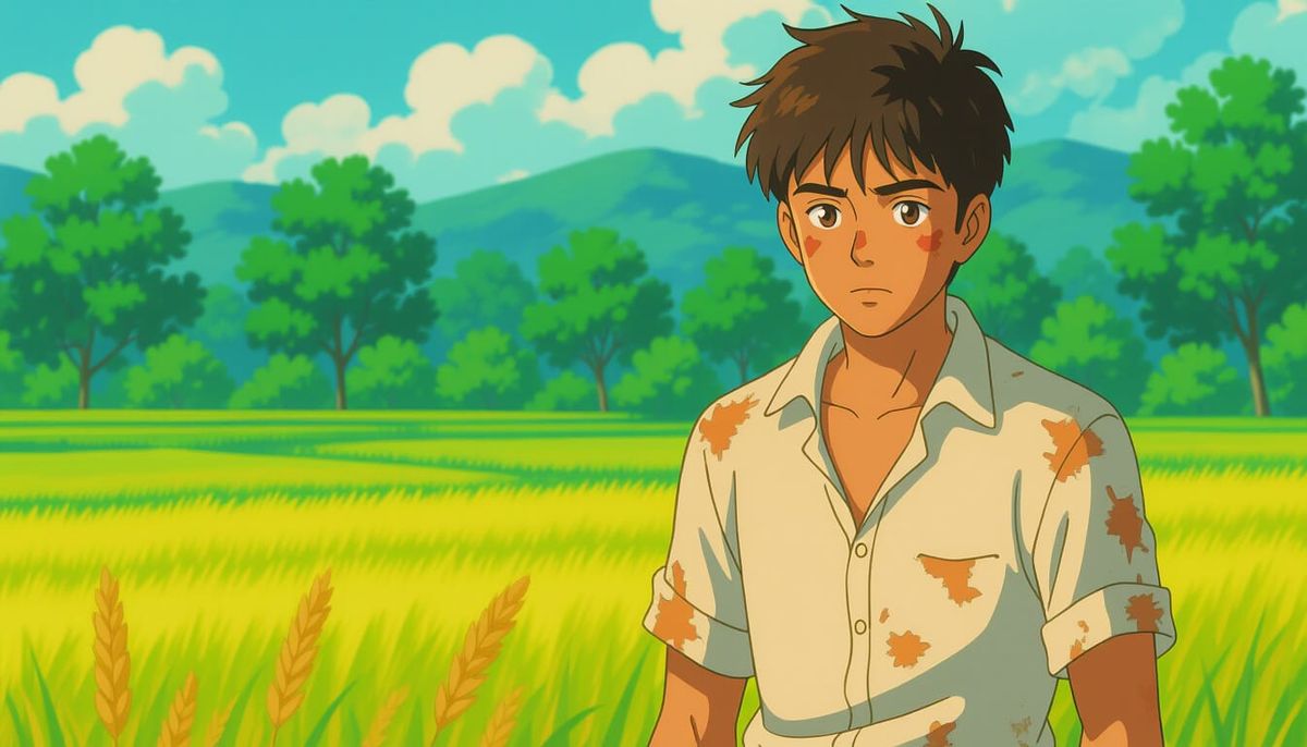 This anime-style illustration features an 18-year-old Indian boy with wheatish skin and a lean build, embodying quiet intensity and strength in a lush rural setting.