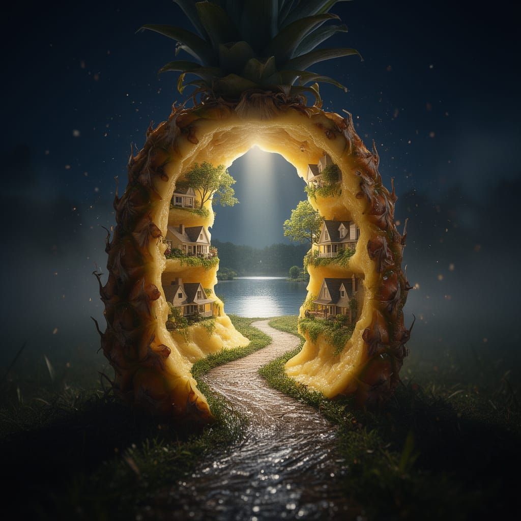 This image shows a hyper-realistic pineapple sliced vertically, revealing a detailed miniature world inside with a lake and houses. Cinematic lighting creates dramatic contrast and atmosphere.