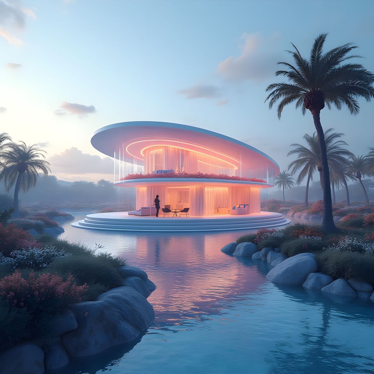 This serene and mystical image features a crystal-clear house floating above a river, reflecting the vibrant colors of a sunset sky. The scene is filled with lush islands, bioluminescent flowers, and delicate trees, creating a sense of wonder and peace. Soft nebulosity and sparkling particles add to the ...
