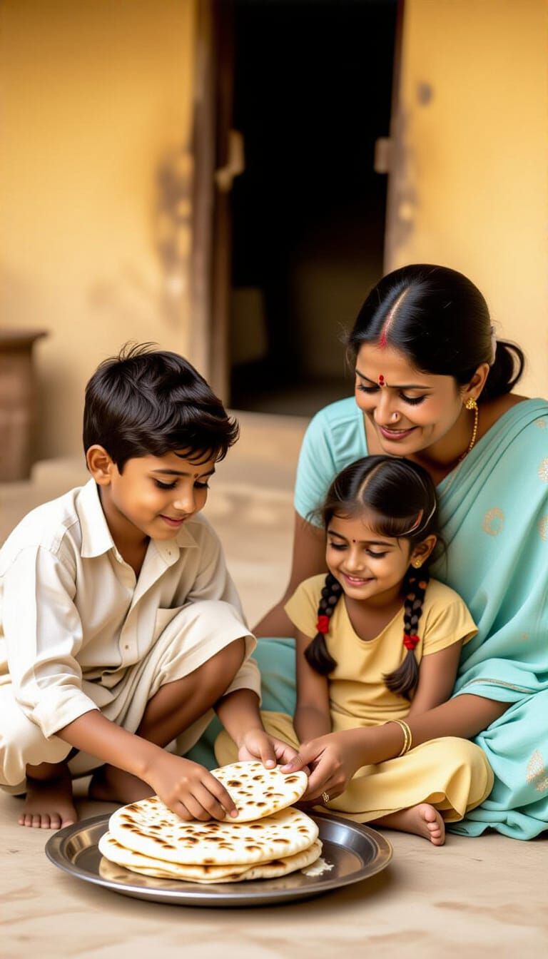 A close-up cinematic scene of a son sharing roti with his mother in a dimly lit mud kitchen. The image captures a moment of deep emotional connection, rendered with dramatic shadows and a shallow depth of field.