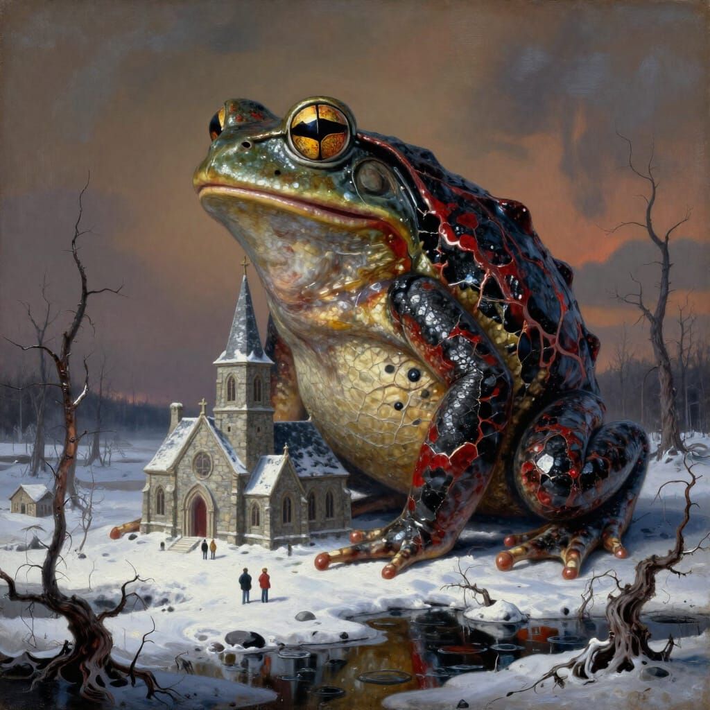 This image depicts a colossal mythological frog, with skin like cracked granite and glowing veins, poised to crush a small church. The scene evokes an apocalyptic yet sacred atmosphere in northern twilight, rendered in a surreal, matte oil painting style.