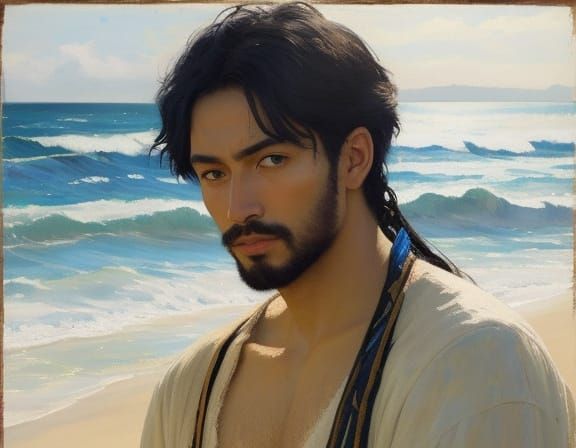 This fine art watercolor painting captures a man on a sun-drenched beach, rendered with luminous, glowing textures and theatrical elegance.