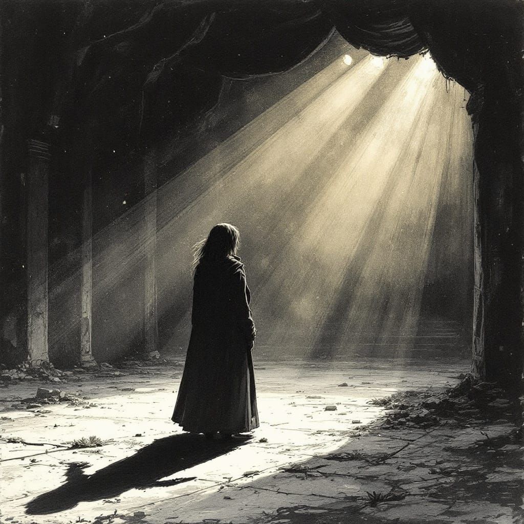 This haunting image shows a woman standing alone on a dusty theatre stage, surrounded by the remnants of a bygone era. Created in a fine ink hatch style with textured shadows and stained paper effects, this evocative scene captures a sense of nostalgia and longing.