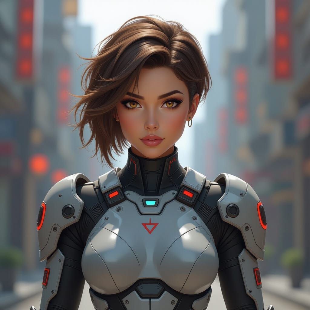 This image shows an Albanian warrior woman with an asymmetrical pixie cut and light brown eyes, clad in high-tech body armor. The artwork is in a vibrant anime style with futuristic and organic elements.