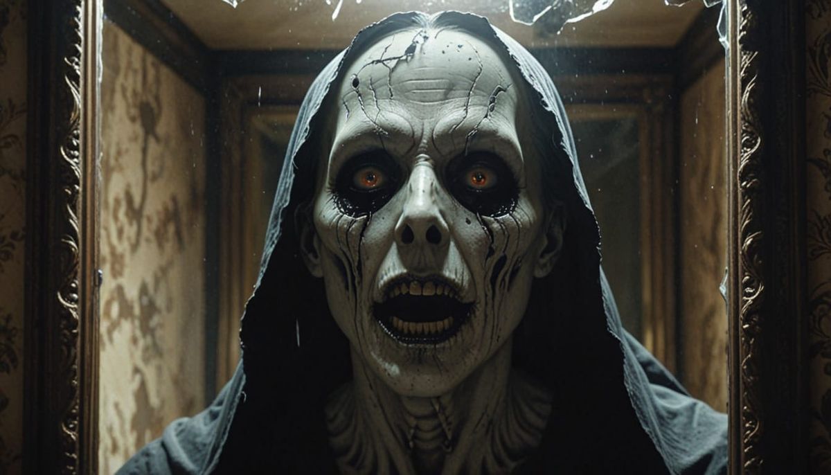 This image shows a frightening, shadowy ghost emerging from a mirror inside a dilapidated, haunted house. The artwork is reminiscent of anime style art.