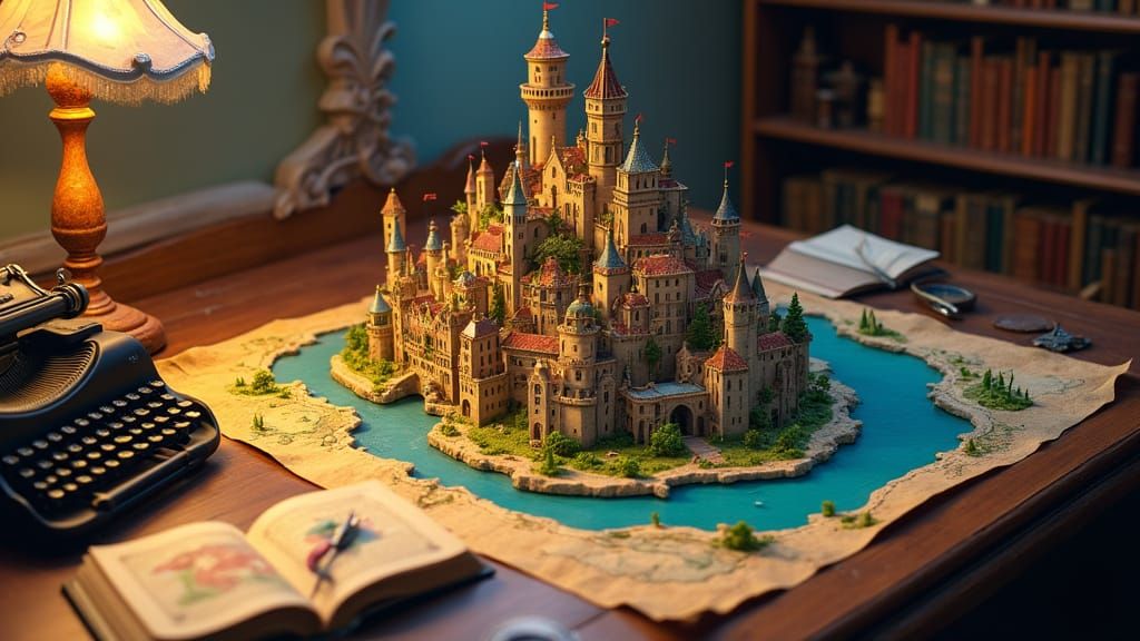 This image showcases a brightly colored, detailed fantasy village illustration on a parchment map, featuring whimsical 3D architecture, a river, and ambient light. A vintage workspace is depicted with a typewriter and compass.