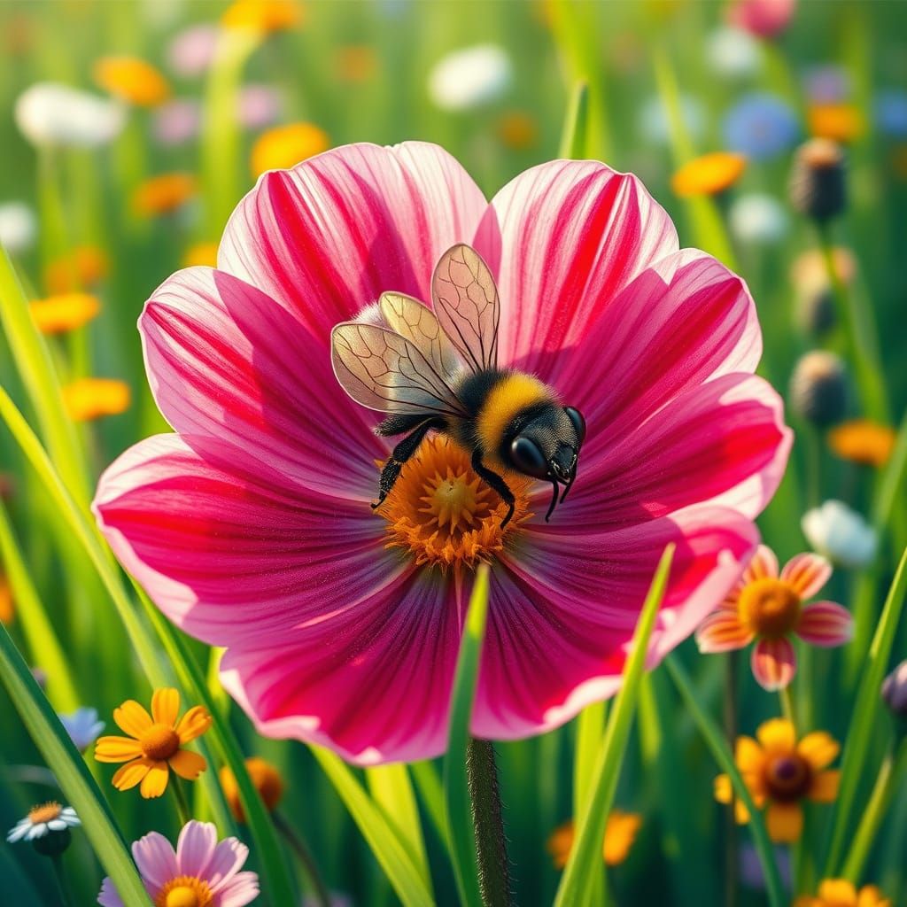 This image showcases a delicate, anthropomorphic bee perched on a sun-kissed flower in a lush field of swaying green grass and vibrant wildflowers, created in a bold, expressive gouache style reminiscent of classic children's illustrations.