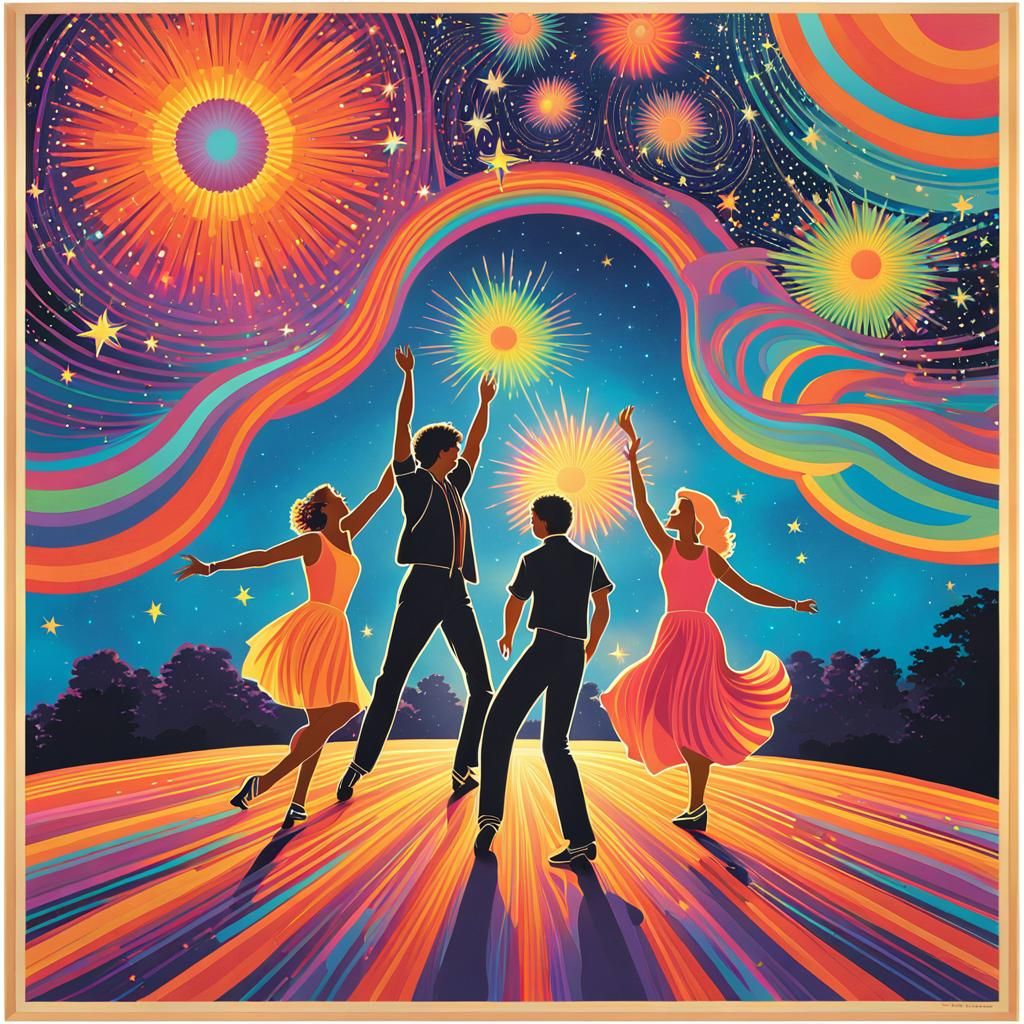 This image shows a psychedelic poster illustration of young people dancing joyfully beneath a vibrant sky. The artwork features swirling starbursts, rainbows, glowing textures, and high-contrast colors in a retro-futuristic style.