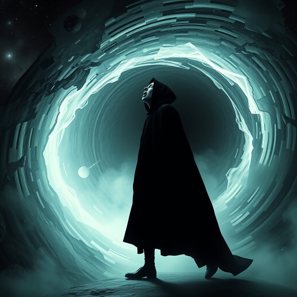 A figure in a dark cloak screams amidst a swirling vortex against a distorted space-time background. The image evokes surreal and haunting art, reminiscent of dystopian and ethereal visuals.