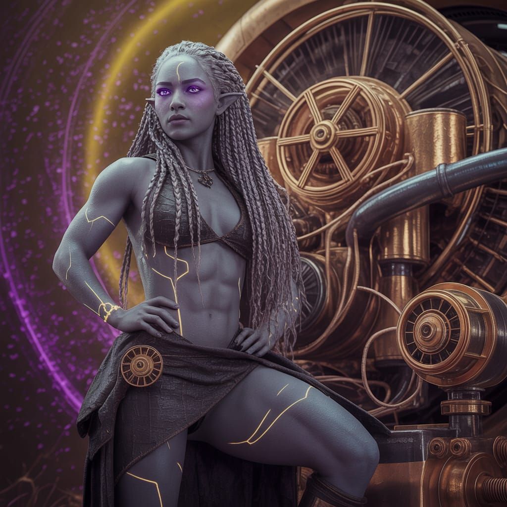 This image shows a muscular drow woman with purple eyes and silver hair, posed in front of a steampunk engine. The scene is lit dramatically, with film grain and volumetric lighting in an epic cinematic style.