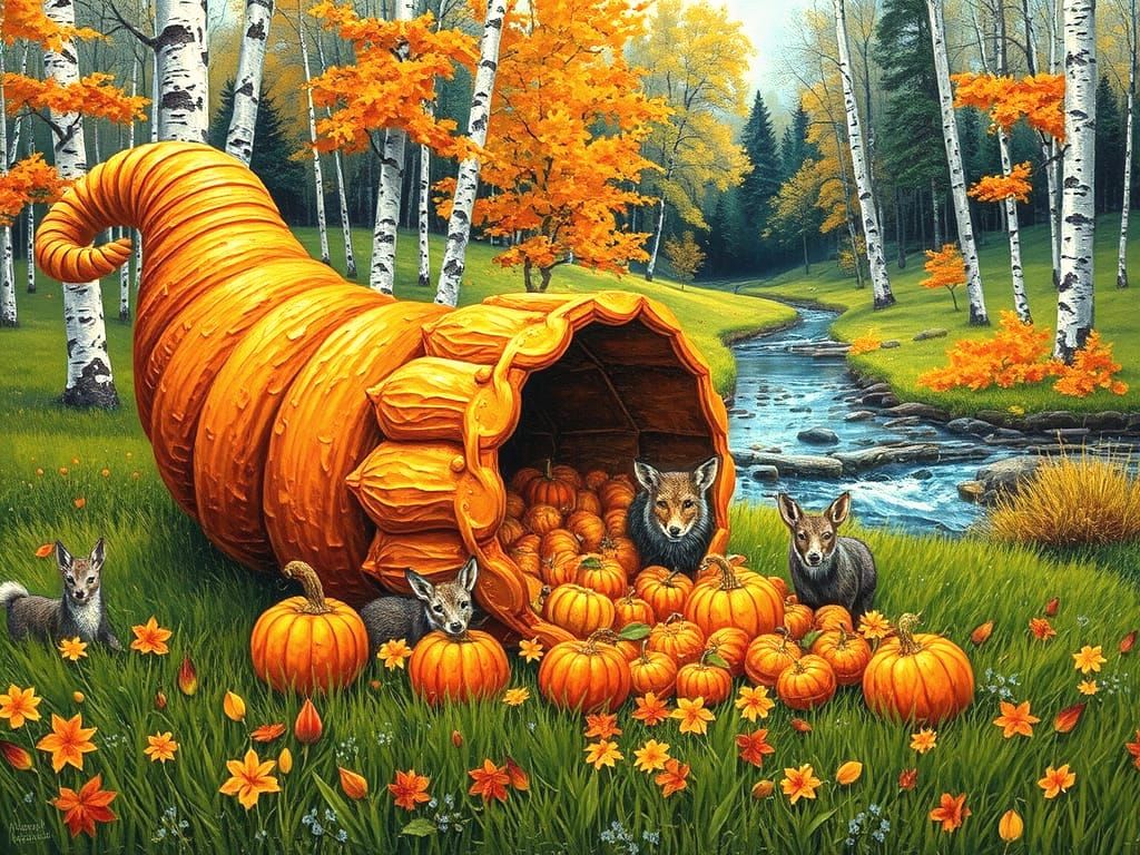 This image showcases a vibrant pumpkin orange cornucopia spilling treasures onto grassy forest floor. Animals gather near birch trees and a creek, rendered in an oil and charcoal impasto technique.