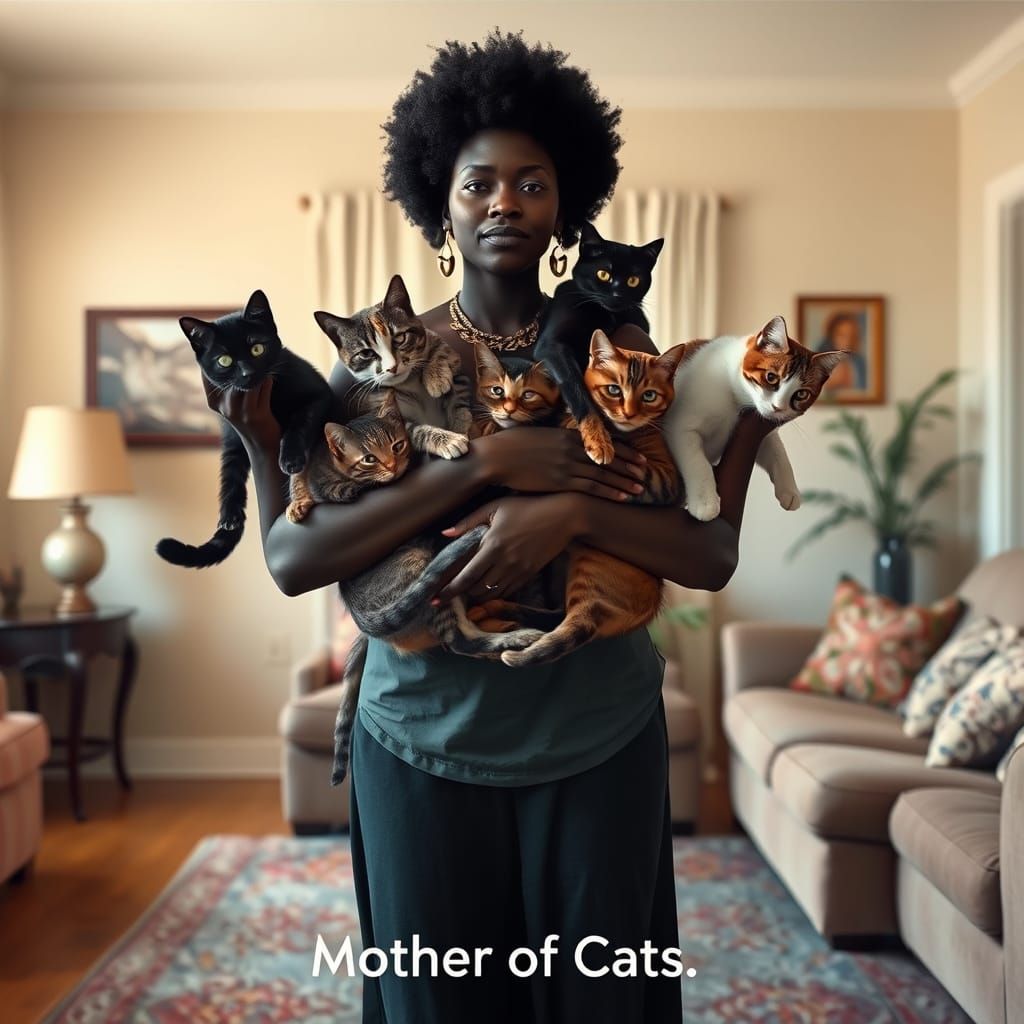 This image shows an Afrofuturistic scene of a Black woman affectionately holding numerous cats in a living room. The artwork is a digital rendering with vibrant colors and bold character design.