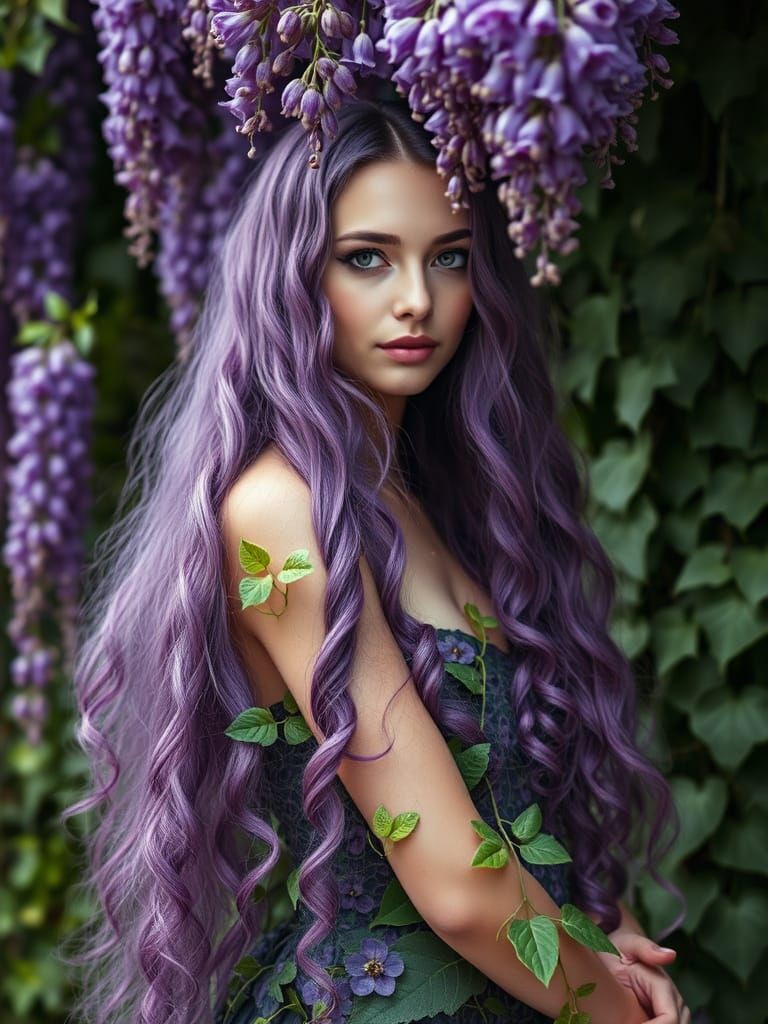 A stunning photorealistic image of a woman with purple hair like wisteria, dressed in ivy, surrounded by vines. Features cinematic lighting and a dramatic atmosphere.