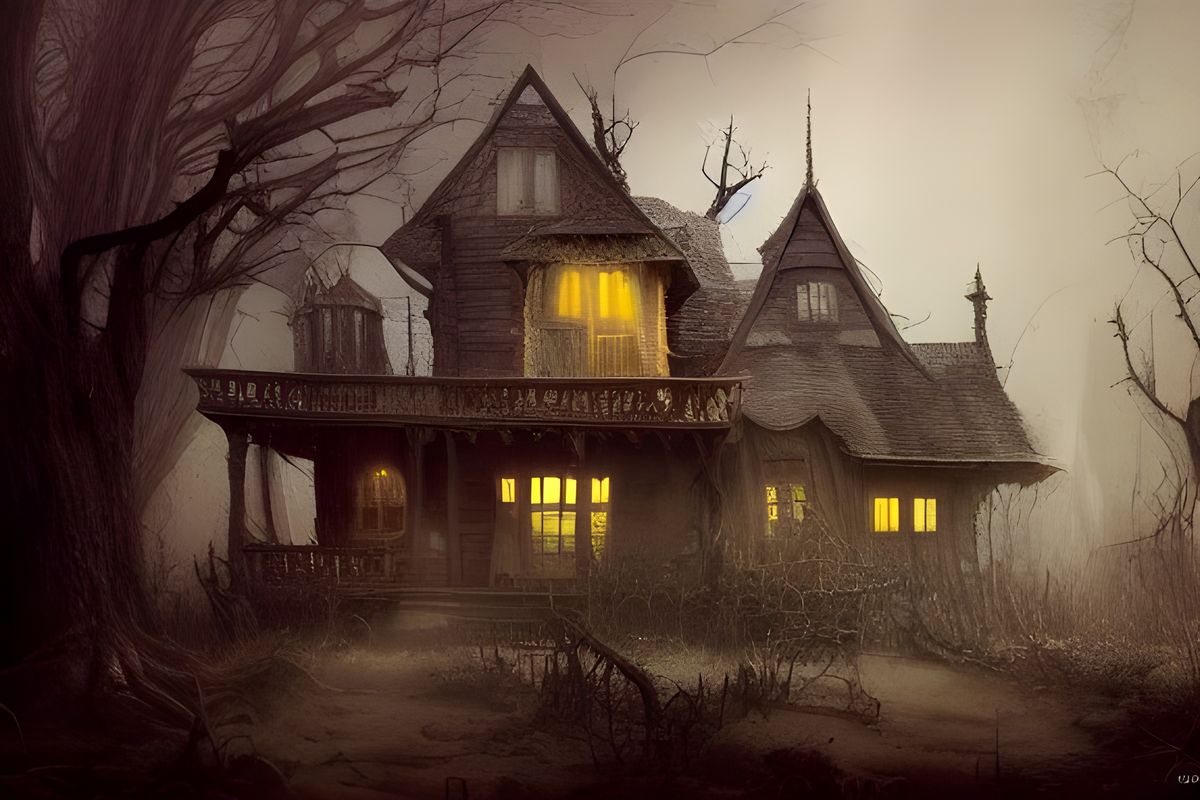 A sinister Halloween witch house with pumpkin decorations. This digital artwork features hyperdetailed horror elements and warm volumetric lighting, reminiscent of trending concept art.